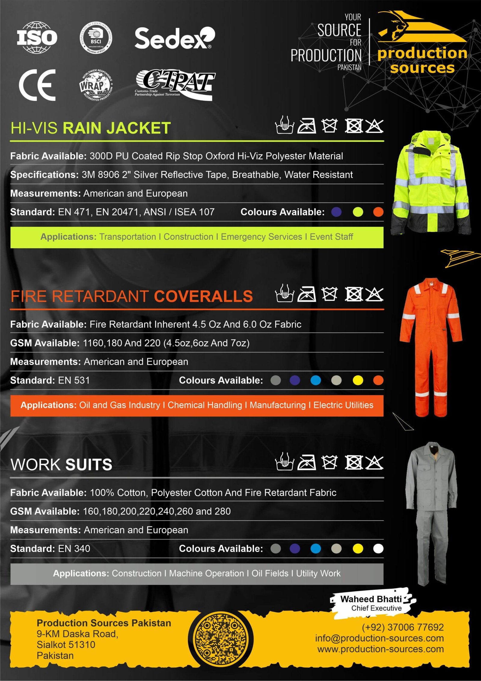 At Production Sources Pakistan, we manage a diverse range of forward-engineered products — from flame-resistant coveralls and cut-protection gloves to tactical uniforms and high-visibility workwear. Every piece reflects purpose-driven sourcing, ergonomic design, and performance-grade textile selection. With innovation embedded in every stitch, we align product development with sector-specific functionality, ensuring durability, compliance, and adaptability across industrial, institutional, and defense applications.